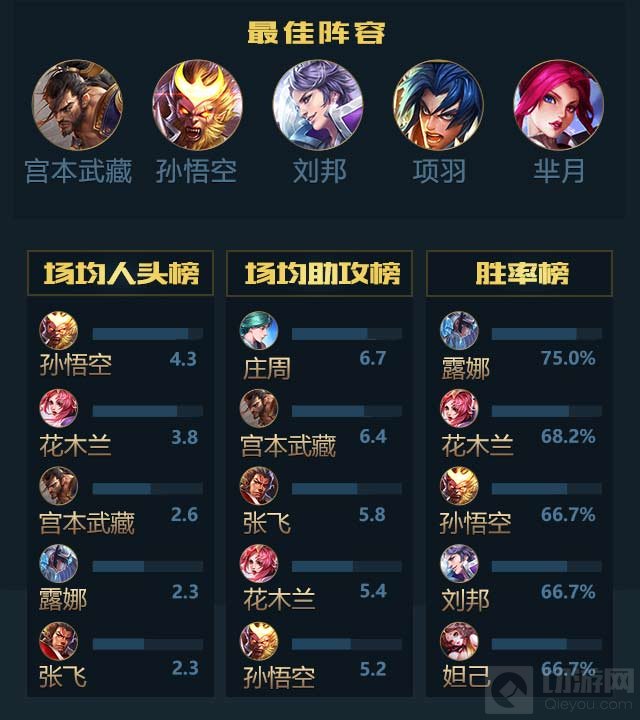 最佳王者阵容推荐:孙悟空、宫本武藏、刘邦、项羽、芈月