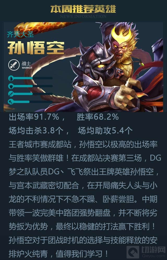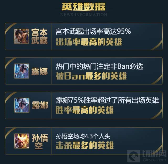 出场率最高的英雄是宫本武藏,高达95%,而最受欢迎的英雄则是露娜,同时她的胜率达到75%超过了其他所有出场英雄,场均4.3个人头的孙悟空则成为击杀最多的英雄。