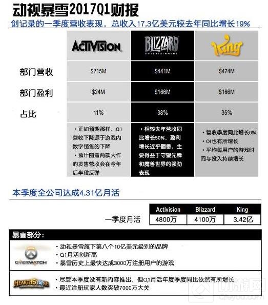 此外,动视暴雪还公布了第一季度三大分部门的相关财报,其中暴雪收入占比达38%。当然除了守望先锋,风暴2.0和炉石新拓展包“勇闯安戈洛”也为暴雪带来了极为可观的活跃与收入。据悉,动视第一季度月活跃用户达4800万,暴雪月活跃用户则达到了4100万。
