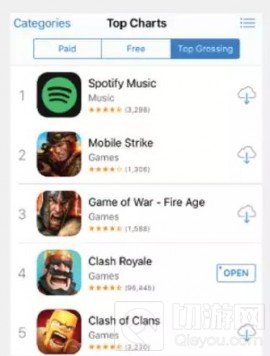 4月26日,音乐流服务应用Spotify登顶美国iOS畅销榜,Supercell的两款游戏分别排在第4和第5名,落后于MZ旗下的两款游戏。