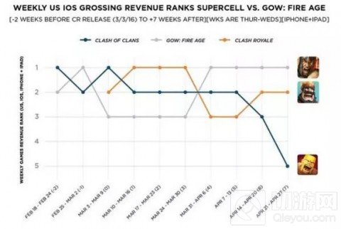 根据图表内容显示,在进入4月份以后,《皇室战争》连续几个星期无缘畅销榜榜首,而《部落冲突》 在美国畅销榜单上的排名更是出现持续下滑的趋势——这是几年来的第一次。