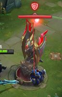另外,我们还在机关血条上增加了一个小提示,就是如图的小盾牌:这个盾牌一旦出现,代表此防御塔周围没有对方的小兵,此时防御塔处于超级防御状态。