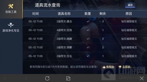 打开游戏内>设置>自助服务 即可查到个人道具、金币、点券、钻石、信誉积分的流水信息。