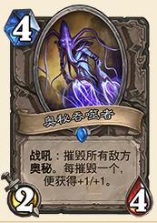 在区别卡牌方面,这套卡组中我加入了毒心者夏克里尔与奥秘吞噬者两张非常规卡牌,其中毒心者夏克里尔被认为是一张配合奥术巨人存在的卡牌,然而在实际对战中我们可以发现,毒心者的存在价值很高,2张1费的法术可以用来试奥秘、触发连击、复活尸魔花、2点伤害或者+3攻斩杀、隐藏加基森以及过牌等等,同时毒心者也可以很好的弥补4费曲线。而奥秘吞噬者这张卡牌这是一张完全针对与国服环境的卡牌,在奥秘法、节奏法横行的高等级分段,奥秘吞噬者可以大大增加你在面对法师时的胜率,让你从劣势对局变为一个均势甚至有些小优的状态。