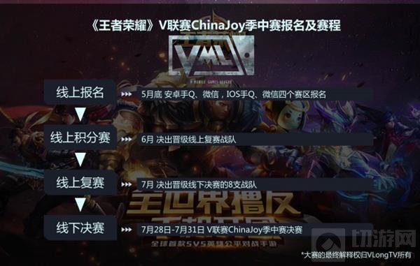 V联赛(VML)ChinaJoy季中赛报名已经开启啦!这次,《王者荣耀》作为其中的项目之一,将采用团队对抗的形式,也就是说需要先组好至少5个人的队才能去报名,而且赛事分为三个阶段,分别是线上海选、线上复赛、线下总决赛。海选分为VML赛区、安卓赛区、iOS赛区三大区,玩家可根据自身情况自由选择,在通过了各赛区的海选晋级复赛后,将会决出最终8强,进军V联赛ChinaJoy季中赛。