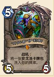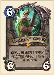 Peter:我们在她身上也调整过很多次。有过很多种设计……我们试过“发现一个任务并把一些能完成任务的牌洗进牌库”,比如拿到战士任务的话就往牌库里洗一些1/3的嘲讽,如果拿到术士任务就给你一些弃牌手段。但我觉得这么做就让任务牌本身变得没那么酷了,毕竟可以从逐星里开出来,这样就不是非得整套牌都围着它转了。当然那样的话也存在这么一个摸光牌库见月明的效果。