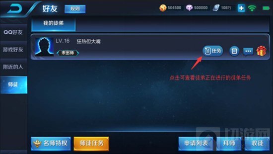 在师徒界面,师父可以查看未出师的徒弟正在进行的徒弟任务,了解其进度,以便利的帮助徒弟完成任务。