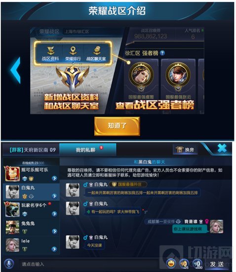 玩家在结束了紧张的一局后,在荣耀地图找到战区,点击进入战区聊天室,可以和同战区的战友沟通交流心得,切磋较量,也可以振臂一呼,组一个五人车队去为本战区赢得荣誉。当然你也可以以游客的身份去其他战区聊天室看看外面的世界。
