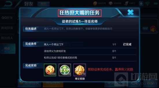 2.点击后可查看该徒弟目前进行进行的徒弟任务和进度。徒弟的名字会出现在任务窗口的顶部。
