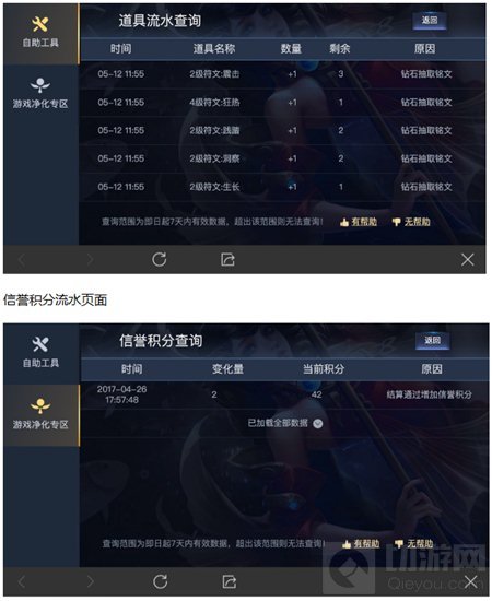 打开游戏内>设置>自助服务 即可查到个人道具、金币、点券、钻石、信誉积分的流水信息。