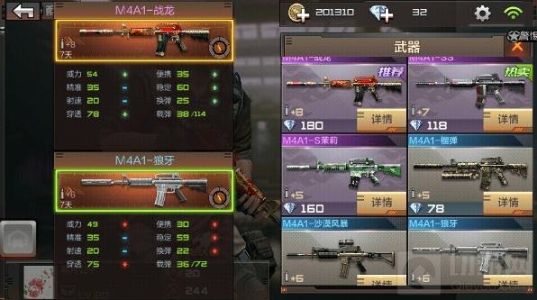 M4A1-战龙在外观上可以说是与M4A1-狼牙两种不同的风格。M4A1-狼牙全身都是银白色,体现出一丝杀气。而M4A1-战龙在涂装上为战龙花纹,高大上风格展露无遗。抛开涂装不说,在属性上,M4A1-战龙在与M4A1-狼牙的对比上略胜一筹。换弹速度和穿透绝对是M4A1战龙的优势。再加上战龙的高伤害和大弹夹可以说能打出成吨的伤害。