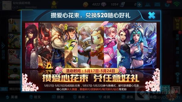 5月17日-5月23日完成组队任务,5月17日-5月22日参与各种模式,都可以获得爱心花束,兑换永久英雄、英雄碎片/皮肤碎片/铭文碎片/钻石等奖励哟~