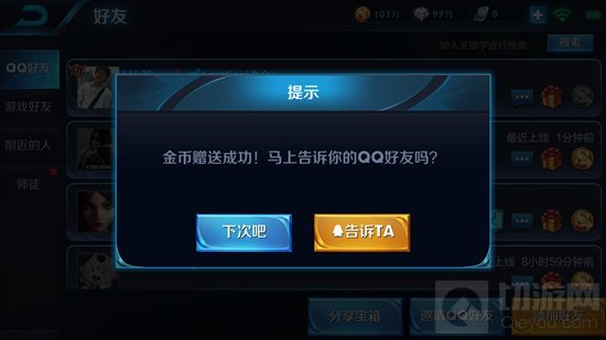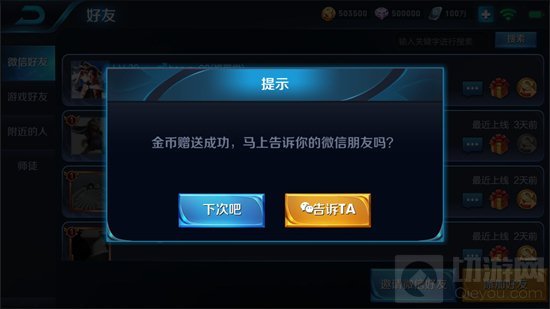 再赠送微信/QQ平台好友金币时,我们在平台好友发送通知消息时的界面上添加了QQ/微信平台图标,以便召唤师尽量明确平台消息发送。