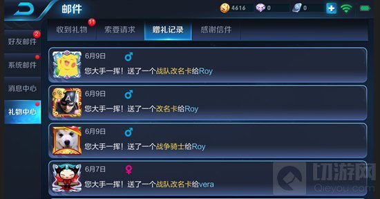 我们将赠送和索要相关的内容都整合到了【邮件】入口下的【礼物中心】,在这里,你可以清晰的查看到所有赠送皮肤和道具相关的内容。