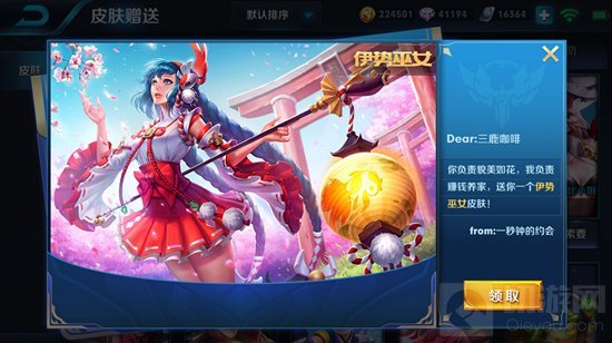 (收取好友赠送皮肤的卡片界面)
