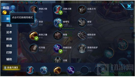 同时,在简洁版的局内装备界面中,“推荐”页面也得以容纳更多信息。除了玩家设定好的出装方案外,适合该英雄的前期过度装备、可选的攻击装和可选的防御装均放入了“推荐”页面,可以在对局中根据实际情况灵活选择。