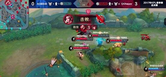 AG超会玩在一分半时成功入侵对方野区,以一波零换三的团战在前期建立起良好的经济优势。12分钟时,QGhappy抓住敌方撤退的时机,前后包夹,打了一波零换五,顺势从下路带线点掉高地防御塔后,再强拆对方水晶,赢得了第四局的比赛,获得春季的冠军。