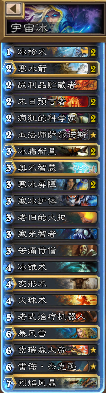 冰法作为炉石老牌卡组,从炉石刚兴起到现在,一直深受玩家们的喜爱。冰法同样也是炉石中操作性和可玩性都很高的卡组,上手有一定的难度。当前环境冰 法大致有三类,带安东尼炎爆的传统冰法、带玛里苟斯的双龙冰法和带雷诺的宇宙冰法。今天我给大家介绍一套操作性最强也是最有乐趣的一套宇宙冰法。首先冰法 内战雷诺冰可以说是最强的,因为其他俩种冰法相当于只有2次救命机会,而我们因为雷诺的存在有3次救命机会。同样因为雷诺的存在,让我们在面对咆哮德的时 候手上也多了几分胜算。下面请看卡组详情。