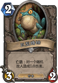 巨型蟾蜍也和蝙蝠有同样的特效,我们可以在后手硬币跳蟾蜍以完美吃掉3血的穴居人,并且他也能对克苏恩卡组4血的暮光尊者或者萨满的图腾魔像造成威胁。