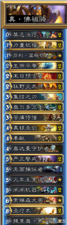 这是一套完美针对目前天梯环境的高胜率打脸圣骑士卡组,从某种意义上来说也属于自闭卡组,通过圣骑士茫茫多的控制手段(如果手里有很多控制手段优先使用效果较弱的)与对手周旋,消耗对手的手牌,用高奶量抵消对手的伤害输出,最后通过OTK手段终结对手。