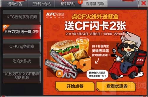 点CF火线外送餐盒,送CF闪卡2张。活动时间:2017.7.24~2017.8.6(10:00~22:00)
