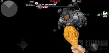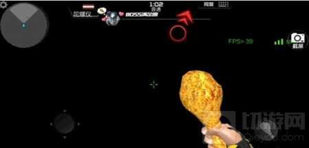正式进入游戏之后,游戏会请求启动我们手机的摄像头。启动之后我们就可以通过屏幕看到我们周围的场景了,而这采用的就是现在的AR技术了,所谓“实景”应该就是指的这个了。我们屏幕中的角色手里拿着一个肯德基的鸡腿,同时还有着一个鸡腿形状的点击键。在屏幕上,我们还可以看到有一个红色的箭头指示一个方向,通过朝着箭头方向移动手机,最终我们可以看到一个Q版的泰坦宝宝悬浮在空中;同时在平面上方有着一个泰坦宝宝的满足度,需要我们通过投喂鸡腿来增加满足度。