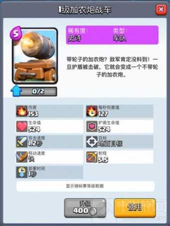 作为接下来四张新卡中首个登场的加农炮战车,实力自然非同一般。与黑暗王子类似,加农炮战车也有一个可以用来抵挡伤害的护盾,护盾被打破后加农炮战车就会立即化身为一座加农炮,不再向前推进,但仍然会在原地持续输出,并起到牵制敌方单位、吸引仇恨的作用。加农炮战车的双形态切换,使其攻守兼备,灵活性极高!入场消耗5点圣水的加农炮战车,1级的时候加上护盾就拥有1048点的防御值,5.5格的攻击范围能够让它拥有充足的输出时间。