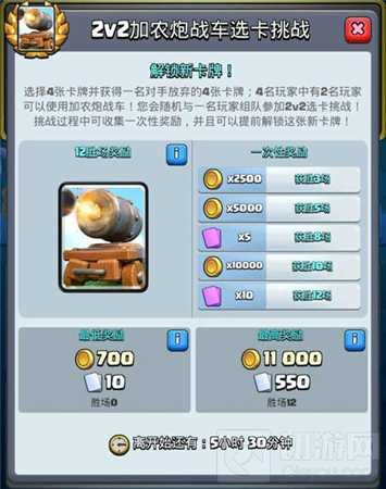 作为本次2v2夏日狂欢月最后一个挑战活动,2v2加农炮战车选卡挑战的奖励自然十分丰厚。只需获胜3场,玩家就可以拿到2500金币的奖励,获胜8场便可提前获得5张加农炮战车,要知道,目前加农炮战车可是无法通过商店购买获得的!如果你实力超群,与队友默契度满分直接拿下12胜,你将获得总计接近30000金币、15张加农炮战车以及海量其他卡牌的奖励!哪怕你运气不佳,直接三负出局也会有700金币和10张卡牌的保底奖励。