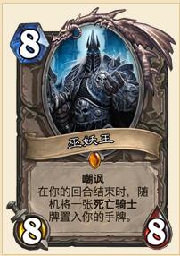 巫妖王的预言实现了!个人认为这张牌将成为很多卡牌的必带卡牌,要知道,即便是回合结束时抽一张牌,那么巫妖王也是很强的,更不谈巫妖王能直接给你造一张死骑牌,让你在疲劳阶段获得非常大的优势,况且,巫妖王造出来的牌可能比你用的牌更强。