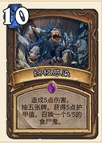 终极感染!这么给力的名字?虽然是10费,但我觉得一定有快攻卡组带它,5伤斩杀,斩不掉还有5牌跟上。而各种大大德,科技德完全可以带2张终极感染,泥潭守护者和滋养会用得更加频繁!这张牌有时甚至能压制对方的死骑英雄。