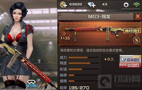 在我开始玩CFM的时候,我一直想买M249-S的,它在当时可是机枪中的王者,在挑战模式中表现不俗。现在MG3-翔龙正在挑战它的地位。在属性上,MG3-翔龙的威力和精度都比M249-S强大,同时载弹量达到了135发。M249-S的优势在于换弹速度快。可以说MG3-翔龙比M249-S强的。