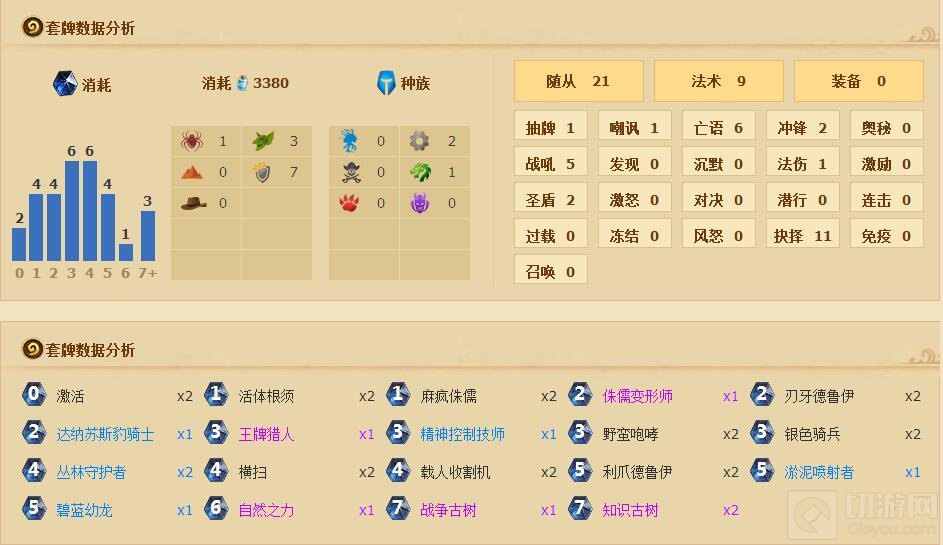 这套牌思路是前期抢脸,站场加上不亏怪解场。后期通过知识古树过牌来维持自己的战斗力。为了尽量减少卡手,我只带了一张树人,加上低费随从较多,所以大帝也就没有必要带了。