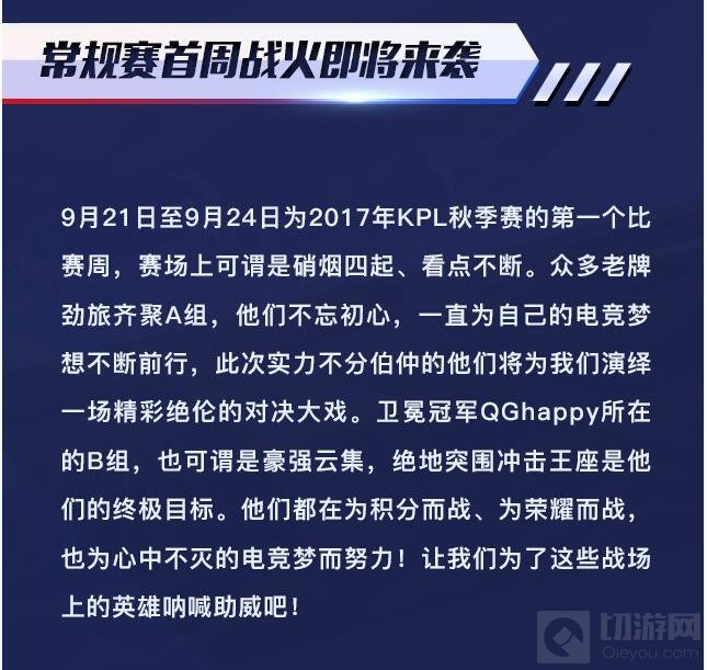 随着2017年KPL秋季赛开赛时间的临近,备战队伍的“赛场之火”也被点燃。全面升级的赛制、闻名遐迩的新星以及注入了“新鲜血液”整装待发的十二支队伍,都让这场即将开启的王者之争备受瞩目!9月21日至11月12日为期八周的常规赛“争分之旅”即将开启,燃爆本年度的最高荣耀之争会带来怎样的观赛感受,每周四、五、六、日为您揭晓!