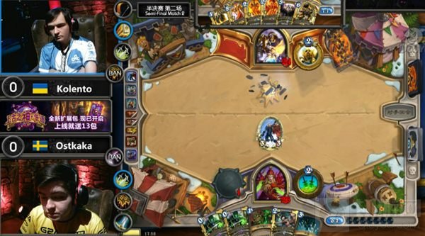 第一局Kolento首发奶骑,Ostkaka有所算计地派出了奇迹贼,可是这把Ostkaka的贼不太走运,迟迟摸不到加基森,节奏慢慢被骑士控制住,6费骑士场上站了凯恩血蹄和科多兽,尽管盗贼用闷棍缓解压力,但是并没有抢到节奏,在骑士拍下佛丁以后,盗贼已无胜算,最终K神的骑士拿下该局,1:0,K神拿下首盘;第二局K神使用奇迹贼,而Ostkaka这边拿出了没有被Ban掉的萨满,萨满前期非常地顺,4费已经狼魂、4费7-7站场,K神果断选择投降,1:1,双方战平;第三局,Ostkaka的奇迹贼面对K神的猎人,Ostkaka的盗贼3费利用双冷血隐藏血法,进行疯狂输出,K神的猎人显然有点发憷,解决不掉,最终Ostkaka抢得了本局胜利;第四局双方打出了异常精彩而又漫长的一局,Ostkaka的瓦王战一度在中期占据优势,K神的猎人利用一只狮子,拿回主动,之后双方不断解场站场,比赛陷入胶着阶段,到了最后双方都靠抽一打一的时候,K神展现抽排功力抽到第二张狮子,而Ostkaka这边抽到的牌则较为糟糕了,之后K神的雷象又拼点胜利,猎人这边又再压了科多兽,战士实在无力应对,K神将比分扳平,双方站成2:2;决胜盘对战,又是十分精彩的一局,K神的奇迹贼面对Ostkaka的瓦王战士,战士抢了盗贼不少血,而K神及时地抽到大范,便利用加基森过牌造出10-10大范,战士这边两个随从都无法解掉,只能拍下罗斯,罗斯表现不错直接打脸,盗贼只有5血,但是战士这边没有激怒吼爹的手段,差1伤成为Ostkaka失败的关键,最终盗贼利用超高场攻和火车王击败了Ostkaka的战士,3:2,K神险胜对手进入到了最后的决赛。
