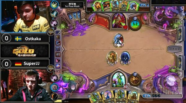 第一局SuperJJ的德鲁伊打出了娱乐效果,面对Ostkaka的奇迹贼,德鲁伊2个狂野争斗者站场,技能激励打出狂暴5攻的效果,SuperJJ心态比较放松也在现场做起了张牙舞爪的表演,最终第一局德鲁伊战胜了奇迹贼,SuperJJ取得开门红,第二盘Ostkaka用动物园迎战SuperJJ的猎人,前者的动物园术士前期非常顺,5费就把猎人打至4血,SuperJJ6费选择了认输,1:1,双方战平;第三盘SuperJJ用宇宙术士迎战Ostkaka的瓦王战士,术士为了在4费回合能够上山岭所以3费没有压末日预言者,导致节奏过慢,被战士找到了第二个斩杀解掉了术士7费利用无面下的两个山岭巨人,最后术士的罗斯面对战士的马尔者罗克选择了怼脸,结果被战士次回合激怒吼爹斩杀,Otskaka再下一城,2:1取得领先;第四盘,Ostkaka仅剩一套奇迹贼,SuperJJ还是宇宙术士,盗贼2费造了一个10-10大范,术士在4费仅剩10血,术士凭借阿古斯和日怒强行苟活到6费,6费术士终于利用灵魂虹吸解决到了超级大范,但是在7费Ostkaka还是凭借盗墓匪贼的5点场攻和血法毒刃的伤害,击杀了术士,3:1,Ostkaka击败了SuperJJ获得季军。