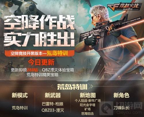 11月15日穿越火线空降竞技开黑版本《荒岛特训》安卓已更新,各位CFer更新即可获得288钻+QBZ-湮灭体验宝箱+荒岛特训精英宝箱。