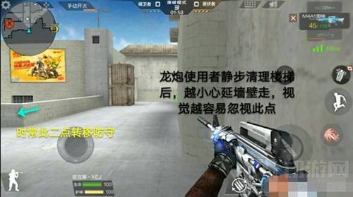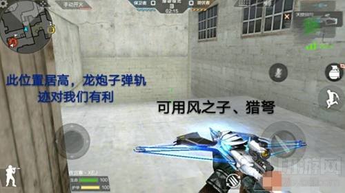 既然敌人使用非常规武器开路,我们为何不选择针尖对麦王呢,龙炮近距离杀伤力确实强,我们选择中距离优势大的武器来克制龙炮,典型的就是风之子、重装天使猎弩!这个位置距离拐角不近不远,小编认为相对是龙炮的虚弱处、我们手中武器的强势处。当龙炮使用者漏出任何进攻A道的现象时,集中注意力,敌人闪身出现的时候往往伴随一发子弹,而这个位置居高,龙炮使用者枪口上扬,子弹随机轨迹上浮的机率就越大,我们安全性不会弱。相信无论是猎弩还是风之子,都可容易击杀。