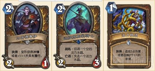 根须和刃牙德鲁伊在起手属于很优秀的生物,豹骑士的亡语虽然并不喜欢,不过他能在前期为我们带来科技的优势。