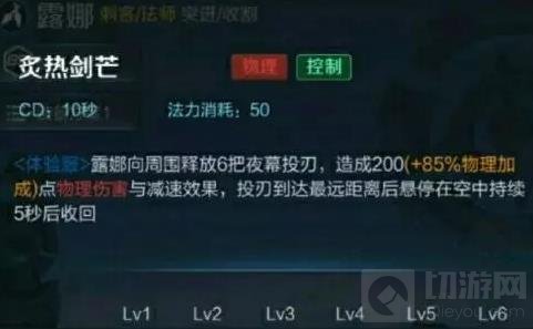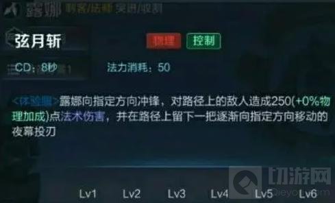 露娜能向指定方向冲锋,且造成一定的伤害,并在路径上留下一把能标记“夜幕”的刀刃。