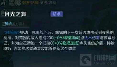 露娜的旧版被动技能是第三下普攻能给敌人标记。但是新版除了能增加“夜幕标记”外,还可以为自己增加一个护盾。果酱觉得新版露娜应该会有更强的站撸能力,不过需要更高的攻速要求。