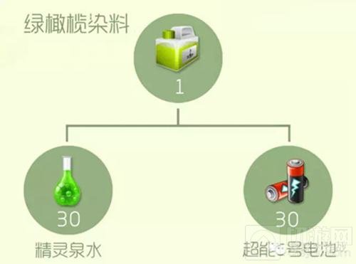 2.通过生存模式来获得精灵泉水(30个)+超能5号电池(30个)合成,合成绿橄榄染料。