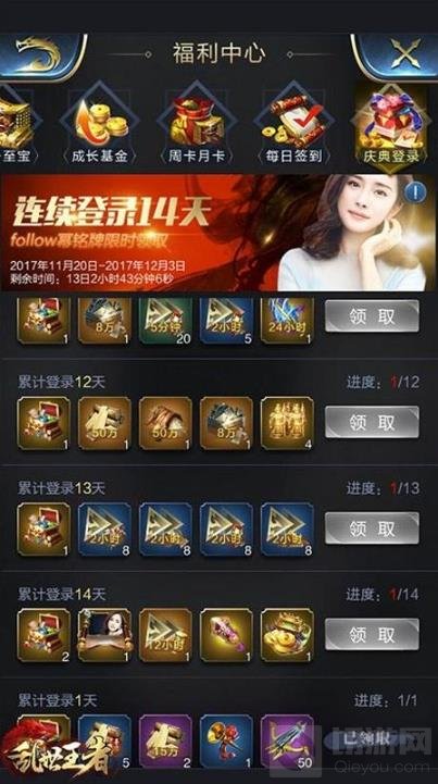 为庆祝全平台公测,《乱世王者》手游狂派福利,登陆游戏即可领取海量道具壕礼。即日起至11月25日,新主公注册游戏,可在游戏内领取总价值3288元的豪华道具礼包,稀有紫色武将“郭嘉”、海量资源等奖励唾手可得。此外,游戏推出“庆典登录”活动,即日起至12月3日,主公累计登录游戏14天,即可免费获得“Follow幂”绝版铭牌以及众多游戏道具奖励。