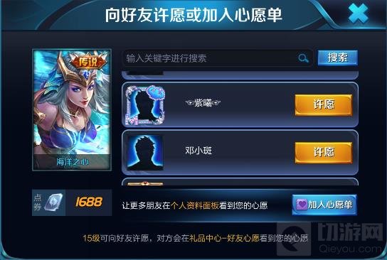 添加心愿单:点击许愿按钮弹出的面板中,可以先指定好友许愿(即以前的索要),选择加入心愿单,即可将皮肤加入心愿单;编辑按钮,可以选择一句代表当前心境的心愿词。