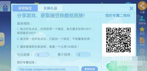 点击首页右上角的分享按钮,然后复制里面的链接,分享给你们的朋友,让他们帮你点击,每个账号一天最多可以获得100个豌豆。