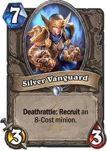 那么银色先锋有机会出场吗?我想可能,尤其是一些控制性卡组里值得玩玩骚套路。 骷髅法师是一个5法力2/2亡语召唤8/8骷髅(如果它在对手的回合中死亡的话),而后者在圣骑士中看到了骷髅法师的潜力,尽管银色先锋队的费用要高得多,但也没那么难触发特效。