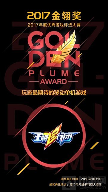 11月16日,2017年金翎奖获奖名单公布,华夏乐游旗下产品《王牌飞行团》荣获“玩家最期待的移动单机游戏”。创办于2005年的金翎奖是中国游戏产业年度最具价值的评选活动,作为“汇聚玩家所爱”的业界盛事,被誉为游戏界“奥斯卡”的金翎奖以其评选的权威性和公正性而受到中国游戏行业的广泛认同。