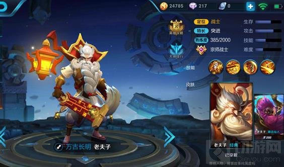 老夫子是游戏内单挑能力较强的英雄,在出到核心装备之后,就能够依靠兵线来牵扯对手,一旦对手有所疏忽,老夫子就可以快速推掉对手的二塔甚至高地。团战中老夫子可以绕后进场,只要大招命中敌方核心英雄,干将莫邪可以在极远的距离跟进输出,基本可以确保敌人必死无疑。