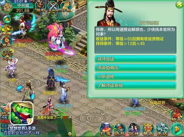 12级以上且未满40级的新手玩家可以到中州城“师徒使者”国子监祭酒处通过“寻师觅徒”快速找到师父列表,选择拜师队伍后发起申请,若对方通过申请则成功建立师徒关系。除了请教师父解答疑难问题以外,徒弟每天上线时可以获得师徒任务,完成后可获得经验奖励及增益BUFF奖励,同时师父可以获得师道值,每个徒弟最多可以完成15次师徒任务。