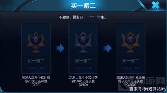 深渊大乱斗新成就—买一赠二,累计获得三连决胜的次数作为达成条件,由于大乱斗是随机选英雄,拿到爆发和收割型英雄是需要碰运气的,因此完成该成就需要不少时间,达到200次三杀可获得黄金成就!