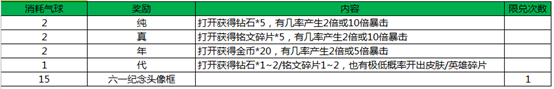 玩游戏,攒气球,兑换随心好礼!活动期间,参与任何模式的5V5对战模式(包括匹配,排位,娱乐模式,赏金赛等),均可获得六一气球,收集气球兑换各种随心礼包!